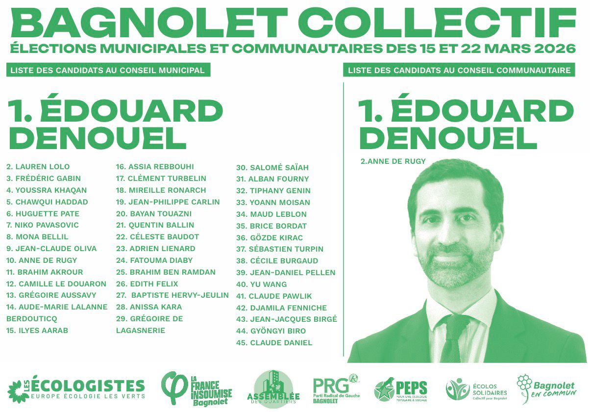 Bagnolet Collectif avec Edouard Denouel c’est l’union de la gauche et des écologistes : le rassemblement des Écologistes, des Insoumis, de l’Assemblee des Quartiers, des radicaux de gauche et de nombreux citoyen-nes engagé-es.