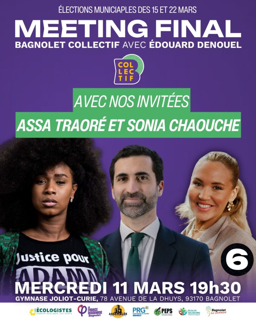 RDV demain, mercredi 11 mars, pour notre meeting de fin de campagne avec nos invitées Assa Traoré et Sonia Chaouche.