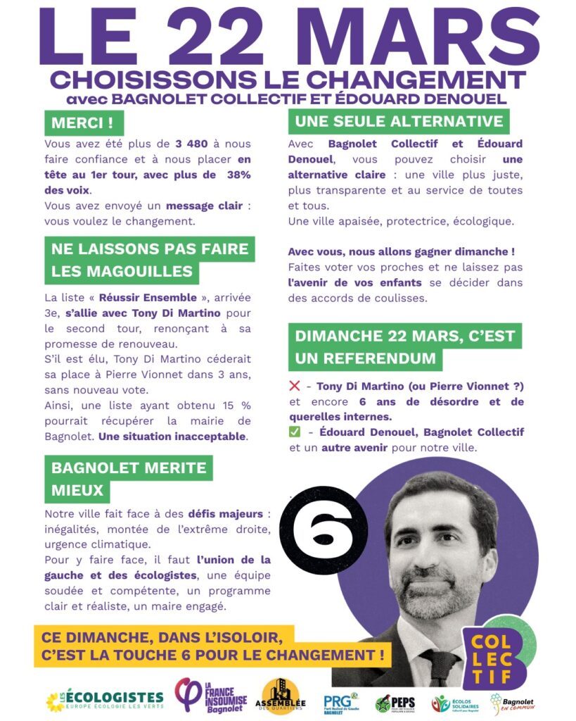 Le 22 mars, une seule alternative au maire sortant et son alliance de circonstances : Bagnolet Collectif avec Edouard Denouel. Un maire engagé et un collectif soudé autour d’un projet commun.